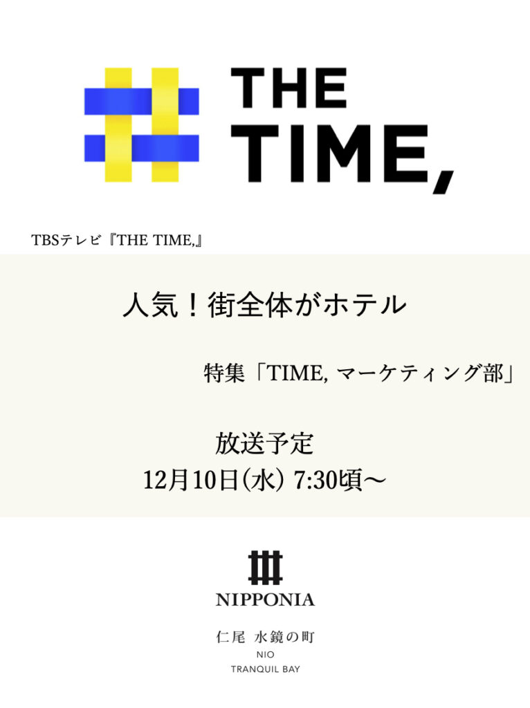TBSテレビ 朝の情報番組「THE TIME,」にて、NIPPONIA仁尾の取り組みが放送されます。